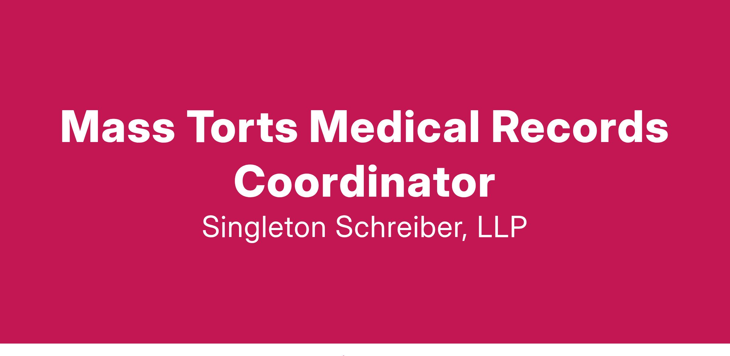 JOB DESCRIPTION: Singleton Schreiber, LLP is seeking a motivated, detail-oriented Medical Records Coordinator to join our Mass Torts team. This position is fast-paced and supports a team of attorneys doing regular litigation in state and federal courts. It will involve collaboration with other medical records coordinators, paralegals, and case assistants.